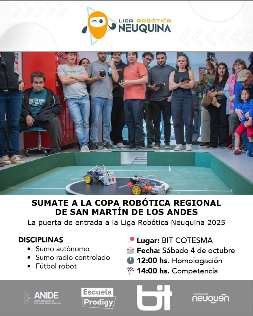 La Base de Innovación Tecnológica Cotesma (BIT) será anfitriona de la Copa Robótica Regional, en el marco de la Liga Robótica Neuquina 2025, el próximo sábado 4 de octubre a las 14:00 h en el Espacio BIT (Gral. Roca 1084).