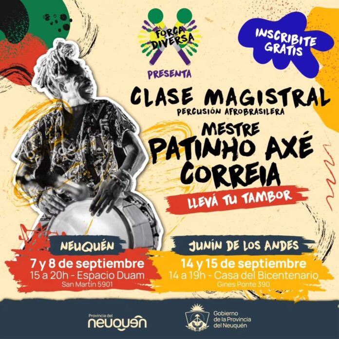 En Junín de los Andes, la Casa del Bicentenario será el escenario de una Clase Magistral de percusión afrobrasileña los días 14 y 15 de septiembre, las entradas pueden adquirirse hasta el viernes 13. La clase, dirigida por el reconocido Mestre Patinho Axé de Ilê Aiyê, se llevará a cabo de 14:00 a 19:00 y es de acceso libre y gratuito, aunque se solicita a los participantes colaborar con un alimento no perecedero.