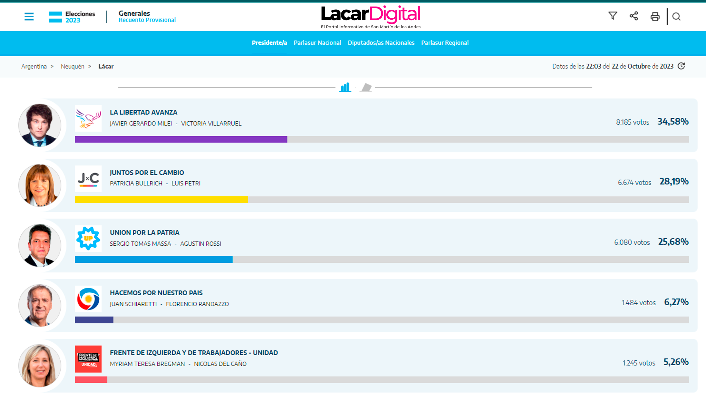 Con un 75% de participación de votantes en la ciudad Javier Milei fue quien sacó la mayoría de votos en nuestra ciudad sobre un total de 24.734 votos en total. Fueron 8185 los votos del Libertario, 6674 votos fueron para Patricia Bullrich, 6080 votos obtuvo Sergio Massa, Juan Shiaretti obtuvo 1480 votos, Myriam Bregman obtuvo 1245 votos. Hubo 533 votos en blanco y 15 votos nulos.