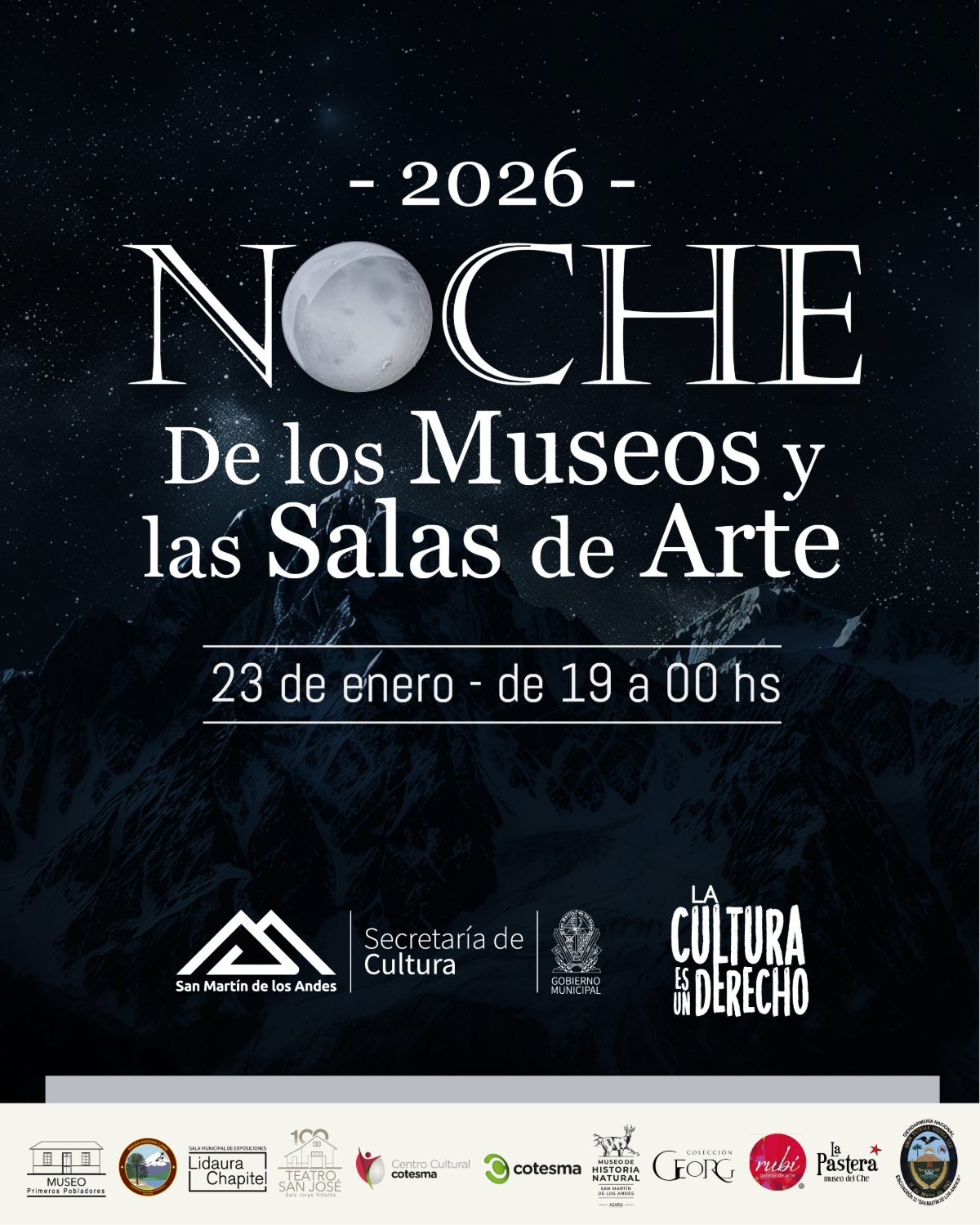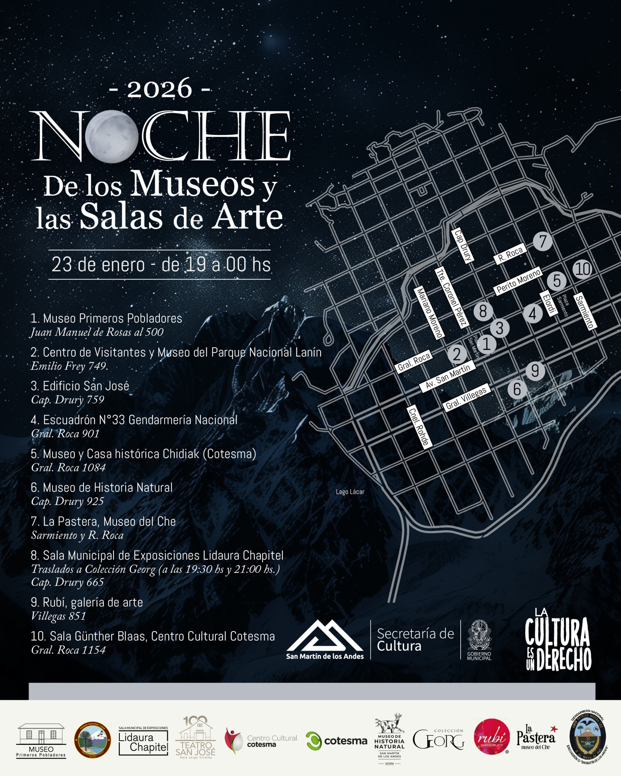Además de los espacios de Cotesma, participan del circuito el Museo Municipal Primeros Pobladores, el Museo y Centro de Visitantes del Parque Nacional Lanín, el Teatro San José, el Escuadrón N°33 de Gendarmería Nacional, el Museo de Historia Natural, La Pastera Museo del Che, la Sala Municipal Lidaura Chapitel, la Galería de Arte Rubí y la Colección Georg (con reserva previa), junto a propuestas especiales como visitas guiadas, música en vivo e inauguraciones de muestras.
