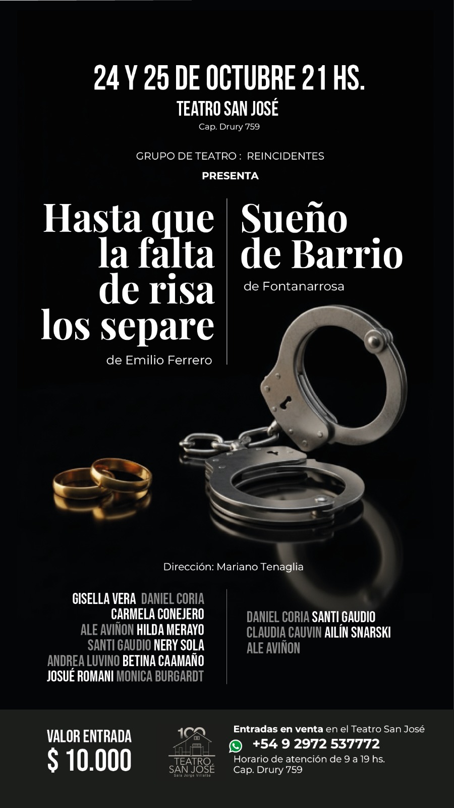 El grupo de teatro Reincidentes sube nuevamente al escenario del Teatro San José con un espectáculo doble que promete risas, reflexión y mucha energía escénica. Las funciones serán el 24 y 25 de octubre a las 21 horas en la sala de Capitán Drury 759, con entradas a $10.000, disponibles en boletería o por WhatsApp al +54 9 2972 537772.