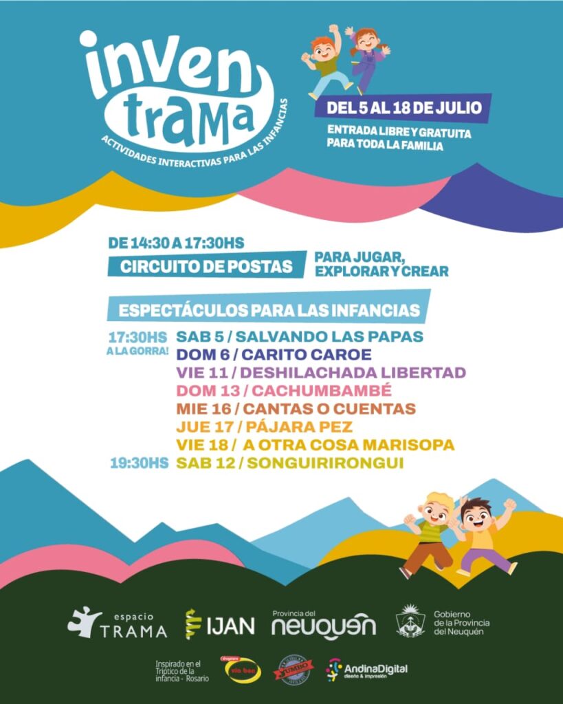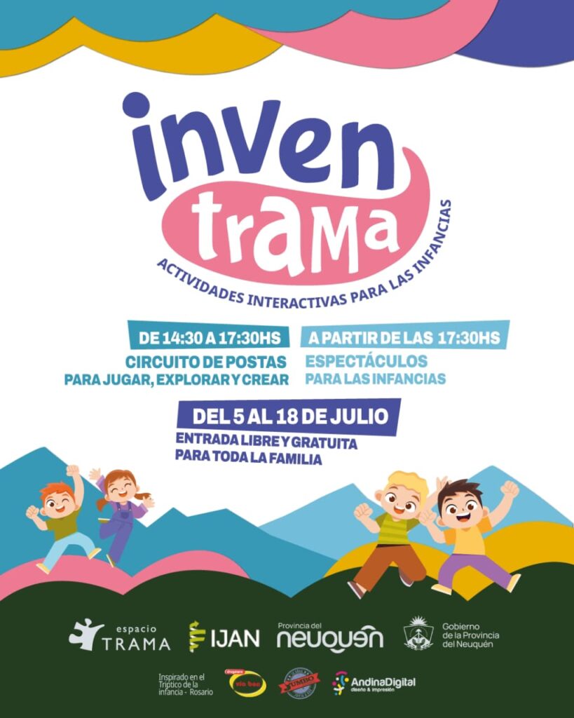 Bajo el lema «Estas vacaciones nos entramamos para jugar», el ciclo InvenTrama ofrecerá un circuito de postas lúdicas y creativas de 14:30 a 17:30 hs. Habrá juegos, actividades para explorar, crear y expresarse libremente. La participación es libre y abierta a todas las familias.