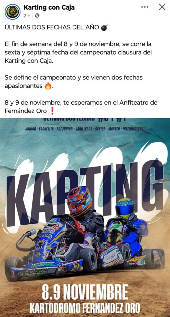El próximo fin de semana, 8 y 9 de noviembre, el Kartódromo de Fernández Oro será sede de las últimas dos fechas del campeonato clausura de Karting con Caja, que llega a su cierre con la disputa de la sexta y séptima jornada del año.