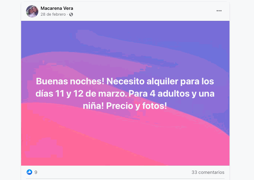 La mujer, llamada Macarena, dialogó con la Asociación Hotelera Gastronómica de San Martín de los Andes (AHGSMA) y explicó que publicó un aviso en Facebook buscando un alquiler temporario: