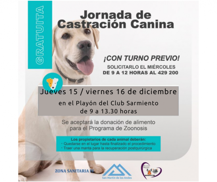 En este mes de diciembre se realizarán dos Jornadas de Castración en el playón del Club Sarmiento, ubicado en la intersección de las calles Weber y Mariano Moreno. Será el jueves 15 y viernes 16, de 9 a 13.30 horas.