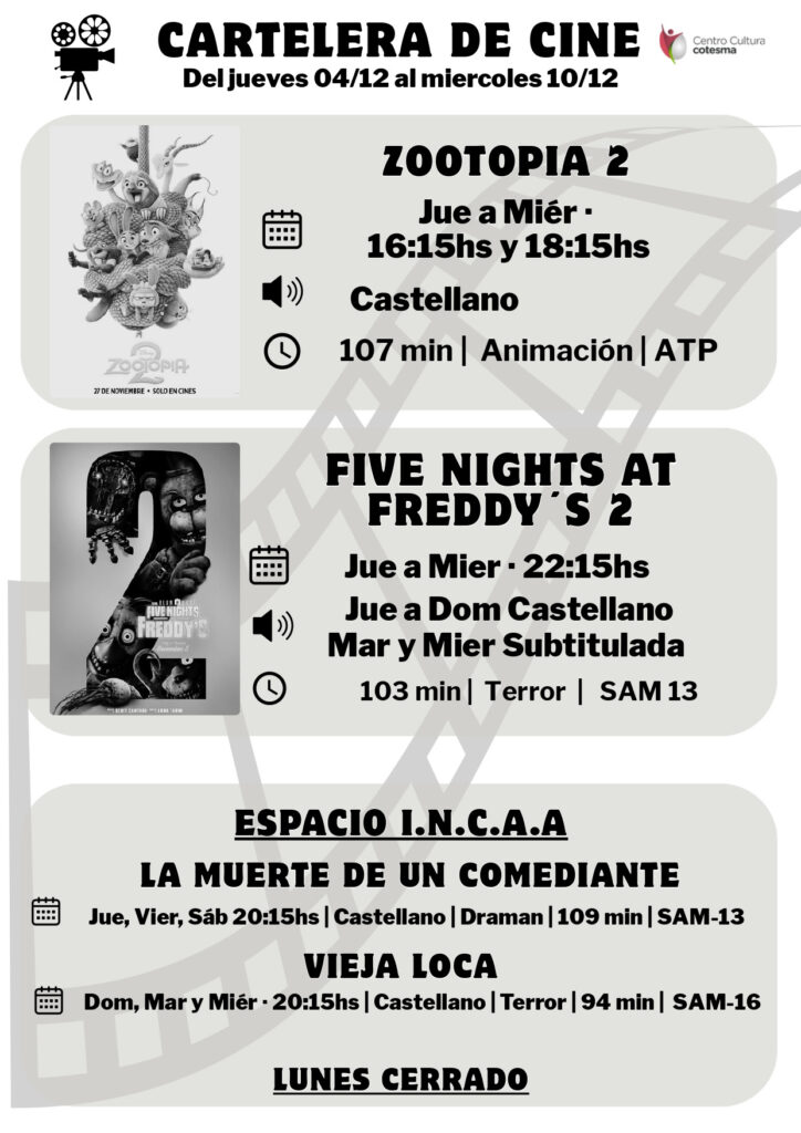 El Centro Cultural Cotesma publicó su nueva programación cinematográfica para la semana del jueves 4 al miércoles 10 de diciembre, con cuatro propuestas que combinan animación, terror y cine nacional dentro del Espacio INCAA.