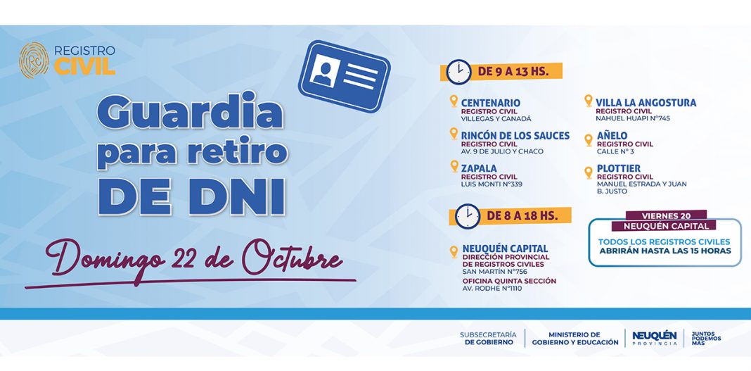 El domingo 22 se abrirán oficinas para retiro de documentos de identidad en distintas localidades del interior provincial y en Neuquén. Además, en la capital el viernes 20 se extenderá la atención hasta las 15.