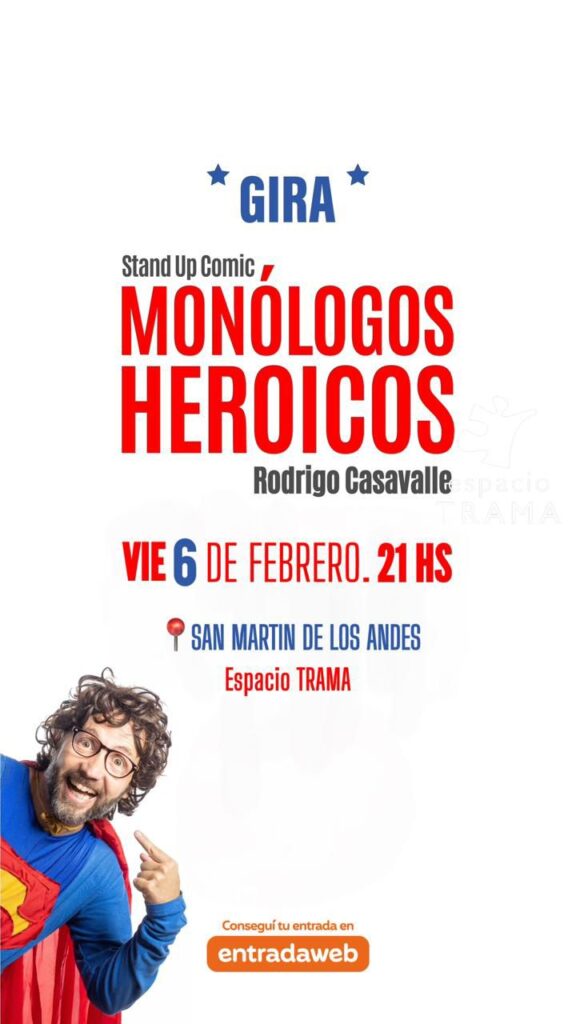 El reconocido comediante Rodrigo Casavalle presentará su espectáculo de stand up “Monólogos Heroicos” en San Martín de los Andes, en el marco de su gira nacional. La función se realizará el viernes 6 de febrero a las 21 horas, en Espacio TRAMA.